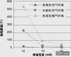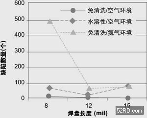 圖3是焊點不良與焊盤的寬度及組裝工藝的關(guān)系。這些數(shù)據(jù)是每種組裝工藝都選用最佳焊盤形式而得出的,試驗時將焊盤的長度和焊盤間距設(shè)為常量,只對焊盤寬度進(jìn)行變化。通常來講,三種組裝工藝的良品率均隨焊盤寬度增大而提高,而不良率在焊盤寬度為0.012到0.015英寸之間較為敏感。水溶性焊膏在空氣環(huán)境中焊接和免清洗焊膏在充氮環(huán)境中焊接都是在焊盤寬度最大即0.018英寸時焊點缺陷最少,但這種情況在免清洗焊膏空氣環(huán)境下焊接時有一些改變,此時最高良品率是在焊盤寬度居中時(0.015英寸)得到的,然而由于使用這種工藝組裝的板子產(chǎn)生的不良數(shù)量非常少,所以焊盤寬度在0.015英寸和0.018英寸時不良數(shù)目之間的差異在統(tǒng)計上并不明顯。如果從組裝工藝的角度來看良品率變化趨勢,可以看到免清洗焊膏在空氣環(huán)境中焊接對焊盤寬度變化最不敏感,而免清洗焊膏在充氮環(huán)境下焊接工藝則對焊盤寬度變化最為敏感。