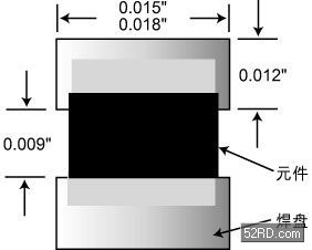 圖4給出批量進(jìn)行0201元件回流焊時的元件焊盤設(shè)計建議。建議兩焊盤間距0.009英寸,焊盤長度0.012英寸,寬度在0.015英寸到0.018英寸之間,具體取決于助焊劑成分類型和焊膏回流焊環(huán)境。0.018英寸寬度適用于充氮焊接環(huán)境、氧氣含量很低(50ppm以下)以及焊劑活性很強或潤濕時間很短的情況;而0.015英寸寬度焊盤則適用于在空氣環(huán)境中進(jìn)行回流焊接、焊膏溶劑活性較弱以及有較長的潤濕時間等情況。