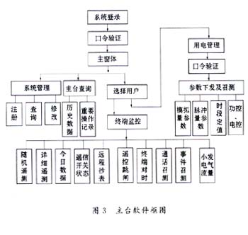 該無線電力負荷控制系統的管理軟件是用面向對象的編程工具VisualBasic6.0開發(fā)完成的,系統軟件框圖如圖3所示。系統啟動后要求輸入操作員工號及口令,驗證無誤后連接電臺,進入主窗體。