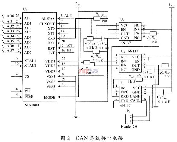 選用芯片82C250作為CAN控制器和物理總線間的驅(qū)動(dòng)接口,可以提供對總線的差動(dòng)發(fā)送能力和對CAN控制器的差動(dòng)接收能力,其最高速可達(dá)1Mb/s。由于實(shí)際系統(tǒng)中存在干擾,故增加高速光隔6N137,以起到隔離的作用。電氣接口很簡單,有CANH和CANL兩根線,用以完成CAN的數(shù)據(jù)傳輸。在CAN總線的兩端有一個(gè)120Ω的電阻,其作用為匹配總線阻抗,用于提高數(shù)據(jù)通信的抗干擾性及可靠性。具體電路如圖2所示。