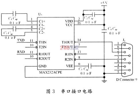 RS232標(biāo)準(zhǔn)是美國電子工業(yè)聯(lián)合會(huì)(EIA)制定的一種串行物理接口標(biāo)準(zhǔn),它適合于數(shù)據(jù)傳輸率在O~20000b/s范圍內(nèi)的通信,目前廣泛用于計(jì)算機(jī)與終端或外設(shè)之間的近端連接。實(shí)際工作時(shí),應(yīng)保證電平在5~15V之間。所以為了與單片機(jī)進(jìn)行通信。必須對其電平進(jìn)行轉(zhuǎn)換?,F(xiàn)在常用的轉(zhuǎn)換芯片是MAX232。MAX232內(nèi)部有電壓倍增電路和轉(zhuǎn)換電路,只需5V電源便可實(shí)現(xiàn)TTL電平與RS232電平的轉(zhuǎn)換,使用十分方便。串口接口電路如圖3所示。