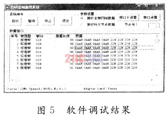 在該接口卡中作者采取了另一種轉(zhuǎn)義字符的方法。首先定義一個(gè)轉(zhuǎn)義字符標(biāo)識OXDBH。對于CAN總線而言,其每個(gè)幀的最大數(shù)據(jù)長度為8,即使將CAN的幀信息和識別碼全部當(dāng)作數(shù)據(jù)發(fā)送,其長度最大也只有13B。這樣可以肯定的是,正常情況下數(shù)據(jù)幀中數(shù)據(jù)長度字節(jié)的高4位必然為0。因此在數(shù)據(jù)發(fā)送之前,首先檢查該數(shù)據(jù)中是否有與起始字節(jié)0X22H、結(jié)束字節(jié)0X33H和轉(zhuǎn)義標(biāo)識0XDBH相同的數(shù)據(jù),如果沒有,則正常發(fā)送;如果有,則檢測出與這兩個(gè)字節(jié)相同數(shù)據(jù)的個(gè)數(shù),并將該個(gè)數(shù)填充到數(shù)據(jù)長度字節(jié)的高4位中;同時(shí),將這些數(shù)據(jù)前添加轉(zhuǎn)義字符標(biāo)識,并將該數(shù)據(jù)進(jìn)行轉(zhuǎn)義。如數(shù)據(jù)0X22H。0X33H,0XDBH…,則轉(zhuǎn)義成0XDBH。0XD2H。0XDBH,0XD3H,0XDBH,0XDDH…。PC機(jī)在接收到數(shù)據(jù)幀后,首先檢查數(shù)據(jù)長度字節(jié),看其高4位是否為0,如果為0,說明該數(shù)據(jù)組不存在轉(zhuǎn)義字符,可以直接處理;如果為N。則表明數(shù)據(jù)組中存在N個(gè)轉(zhuǎn)義字符,并且每個(gè)轉(zhuǎn)義字符都以0XDB開始,需要首先將它們重新修改回原始數(shù)據(jù)。相比而言,這種辦法有很好的穩(wěn)定性和接口利用率,其數(shù)據(jù)流量也不會(huì)很高。