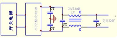 第二種方法的抗干擾設(shè)計考慮如圖8所示,圖中在交流輸入通道上設(shè)計線路濾波器對系統(tǒng)抗干擾具有很好的作用。其中CX為差模濾波電容(又稱X電容)跨接在輸入端之間,對差模電流起旁路作用,容值一般為0.1—1uF.LY為共模電感,用來抑制共模干擾電流。CY為共模電容(又稱Y電容),跨接在線路與機(jī)殼之間,對共模電流起旁路作用,但電容值不能過大,否則會超過安全標(biāo)準(zhǔn)中對漏電流的限制要求,一般在10000PF以下。