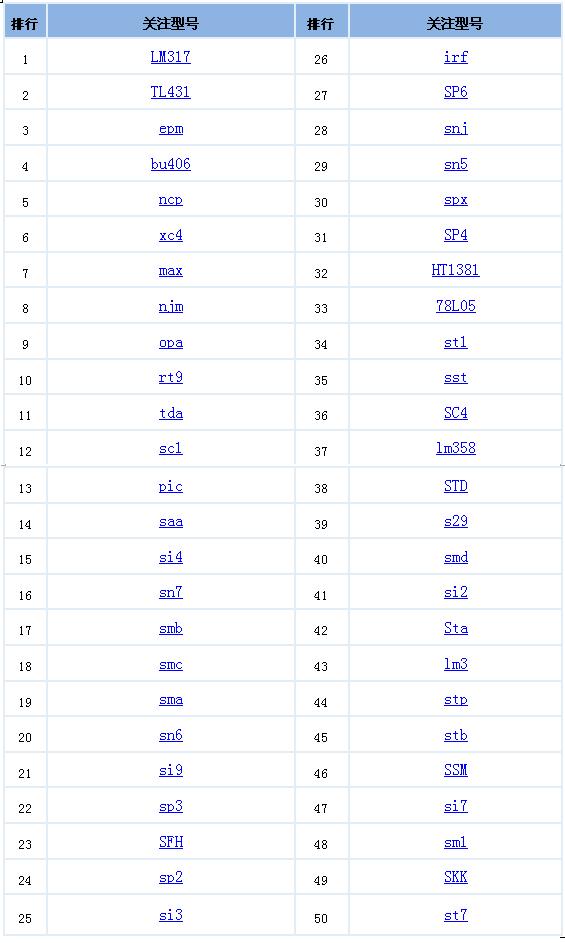 為客戶跑腿的除了快遞員,還可能是《華強(qiáng)電子》的小編?。?!為了客戶跑遍華強(qiáng)北的小編你更是傷不起!從這個(gè)月起,商戶們記得要盯緊《華強(qiáng)電子》了,小編將定期不辭辛苦地掃蕩華強(qiáng)北市場,嘔心瀝血為廣大商家整理出一周熱門搜索排行榜!哪些IC型號(hào)最搶手,哪些獲得最多的詢價(jià),前50名讓你一目了然!如果您口味比較獨(dú)特,前50名沒有讓你感興趣的型號(hào),盡管來電咨詢,小編恭候您的電話。有更好的建議歡迎交流,求關(guān)注!求進(jìn)步!