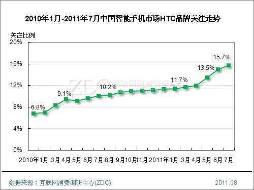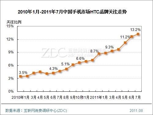 ZDC統(tǒng)計數(shù)據(jù)顯示,中國整體手機市場上,2010年1月至今,HTC品牌關注比例呈現(xiàn)出直線上升走勢,2010年1月僅為3.5%,如今已經(jīng)達到13.2%,且在中國手機市場品牌排名中躋身前三甲。