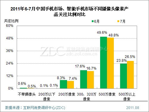 (圖) 2011年5-6月中國3G手機市場不同像素產(chǎn)品關注比例對比