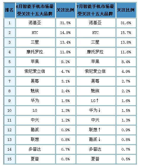 - 7月份諾基亞用戶關注比例為31.6%