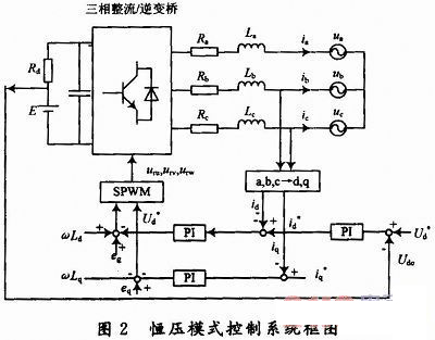 在對(duì)機(jī)車蓄電池充電時(shí),為了快速充電同時(shí)延長(zhǎng)電池的使用壽命,將充電與放電過程分成不同的階段,可以視具體情況分階段選擇恒流或者恒壓模式充放電。恒壓充放電模式采用電壓定向控制模式,控制框圖如圖2所示??刂撇呗圆捎秒p閉環(huán)結(jié)構(gòu),外環(huán)控制直流電壓,內(nèi)環(huán)控制電流。電流內(nèi)環(huán)作用是提高系統(tǒng)的動(dòng)態(tài)性能和實(shí)現(xiàn)限流保護(hù),電壓外環(huán)的作用是保證直流側(cè)電壓的穩(wěn)定性。直流輸出電壓給定信號(hào)和實(shí)際直流電壓Vdc比較后的誤差信號(hào)送入P1調(diào)節(jié)器,PI調(diào)節(jié)器的輸出即為主電路交流輸入?yún)⒖茧娏鞯姆?,比較得到電流誤差后,對(duì)電流誤差進(jìn)行PI調(diào)節(jié),用以減緩電流在動(dòng)態(tài)過程中的突變。然后再與輸入電壓的空間矢量進(jìn)行比較控制,最后通過SPWM調(diào)制算法即可生成相應(yīng)6路驅(qū)動(dòng)脈沖控制三相整流橋IGBT的通斷,間接地控制網(wǎng)側(cè)電流,實(shí)現(xiàn)網(wǎng)側(cè)功率因素的調(diào)節(jié)。