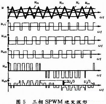 本文采用SPWM調(diào)制方式。圖2中,三相調(diào)制信號(hào)uru、urv和urw為相位依次相差120°的正弦波。a,b,c相自關(guān)斷開關(guān)器件的控制方法相同,現(xiàn)以a相為例:在uru>uc的各區(qū)間,給上橋臂電力晶體管V1以導(dǎo)通驅(qū)動(dòng)信號(hào),而給下橋臂V4以關(guān)斷信號(hào)。在uru<uc的各區(qū)間,給V1以關(guān)斷信號(hào),V4以導(dǎo)通信號(hào)。圖5是三相橋式PWM逆變電路輸出三相對(duì)于負(fù)載中性點(diǎn)N的相電壓波形。