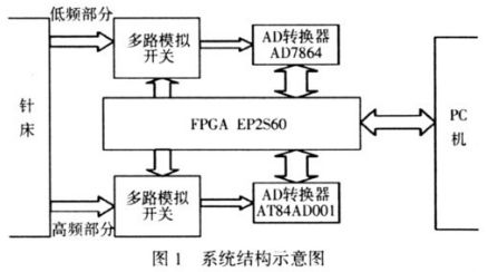 本自動(dòng)測(cè)試系統(tǒng)的結(jié)構(gòu)框圖見圖1。系統(tǒng)的工作原理是:通過針床將待測(cè)信號(hào)導(dǎo)出,F(xiàn)PGA 通過控制多路模擬開關(guān)將待測(cè)信號(hào)采集進(jìn)來,將數(shù)據(jù)通過相應(yīng)協(xié)議傳送到PC 機(jī),用自動(dòng)測(cè)試軟件測(cè)試各個(gè)信號(hào)是否正常。