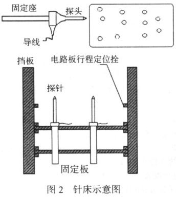 針床是電路板測(cè)試系統(tǒng)的重要部件,是電路板信號(hào)導(dǎo)出的平臺(tái)。針床的通用性較差,一般是每種電路板對(duì)應(yīng)一個(gè)特定的針床,這使系統(tǒng)的通用性受到很大的限制。為使針床具有一定的通用性,本系統(tǒng)中對(duì)針床的相關(guān)部件進(jìn)行了一些改進(jìn):