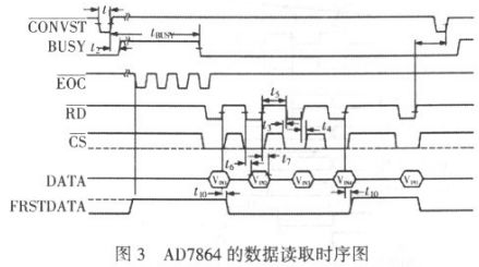 (1)低頻部分。本部分主要采集的是電源信號(hào)和電平變換信號(hào),采用AD7864 作為采集芯片。AD7864 具有片內(nèi)時(shí)鐘、讀寫允許邏輯、多種通道選擇方式以及內(nèi)部精確的2。5 V 參考電壓,這使得其與高速處理器的接口變得非常簡(jiǎn)單。AD7864 轉(zhuǎn)換后的數(shù)據(jù)讀取采用轉(zhuǎn)換后讀取數(shù)據(jù)的方式,其讀取時(shí)序見圖3。