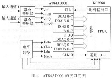 (2)高頻部分。主要是對(duì)脈沖數(shù)字信號(hào)的采集,包括頻率測(cè)量和信號(hào)采集兩個(gè)部分。脈沖數(shù)字信號(hào)的頻率是確定電路板是否工作正常的重要參數(shù),因此確定脈沖信號(hào)的頻率是否正常是本測(cè)試系統(tǒng)的必要工作。本系統(tǒng)是將待測(cè)信號(hào)接入FPGA 與53MHz 的高精度時(shí)鐘同時(shí)開始計(jì)數(shù),一段時(shí)間后,通過兩個(gè)信號(hào)的計(jì)數(shù)值來計(jì)算脈沖信號(hào)頻率的。信號(hào)采集是以AT84AD331 作為采集芯片。AT84AD331 與EP2S63 的連接見圖4。