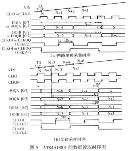 AT84AD331 可以配置成I 路和Q 路單獨(dú)使用,此時(shí)可以同時(shí)采集兩路信號(hào),最高采樣率為1 Gs/s;也可以配置成I 和Q 路的交錯(cuò)采樣,此時(shí)只能采集1 路信號(hào),等效采樣率為2 Gs/s,使用時(shí)可以根據(jù)需要對(duì)該芯片進(jìn)行在線配置。FPGA 對(duì)AT84AD331數(shù)據(jù)讀取時(shí)序見圖5。