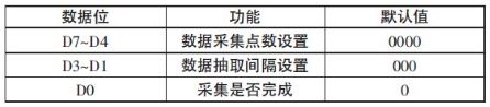 其中D7~D4 為數(shù)據(jù)采集的點(diǎn)數(shù)設(shè)置,3333B 表示64 個(gè),1111 表示1 324 個(gè),步進(jìn)為64。D3~D1 為數(shù)據(jù)抽取的間隔設(shè)置,333 表示抽取間隔為3,全部數(shù)據(jù)有效;111 表示抽取間隔為28,即每隔28 個(gè)點(diǎn)抽取一個(gè)點(diǎn),步進(jìn)為4。設(shè)置這幾位的目的是為了適應(yīng)信號(hào)頻率的要求,防止采集數(shù)據(jù)不足一周期的狀況發(fā)生。D3位為標(biāo)志位,功能和操作與5 bit 的寄存器的對(duì)應(yīng)位完全相同。本寄存器分高4 位和低4 位兩次設(shè)置。
