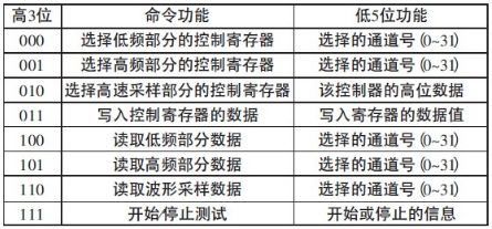 PC 機(jī)發(fā)送的控制字都是8 位的,其中高3 位為控制命令字,用來區(qū)分8 個(gè)命令,低5 位為輔助功能,具體見表3。FPGA 接收到主機(jī)發(fā)來的命令信號(hào)后,按命令執(zhí)行相應(yīng)的操作。