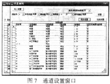 設(shè)置窗口見圖7,本窗口中可以設(shè)置每一路信號(hào)的屬性,也可以直接調(diào)出以前保存的設(shè)置,設(shè)置完成后即可按該設(shè)置進(jìn)行測(cè)試。設(shè)置完成后,可以將本次的設(shè)置保存成文件,以便下次直接調(diào)出。