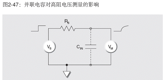 在對(duì)高阻抗源進(jìn)行電壓測(cè)量時(shí)(圖2-47),電壓表(VM)兩端的電容(CIN)必須通過(guò)RS充電。輸出電壓對(duì)時(shí)間的函數(shù)關(guān)系為: