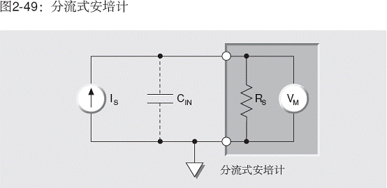 使用分流型安培計(jì)(圖2-49)時(shí),輸入電容對(duì)電流測(cè)量的影響與電壓測(cè)量時(shí)類(lèi)似。分流型安培計(jì)可以看成是在其輸入端跨接了電阻器的電壓表。電路表明,輸入電容(CIN)必須以時(shí)間常數(shù)RSCIN的指數(shù)速率,充電到ISRS伏。注意,CIN是源、連接電纜和儀表電容之和。