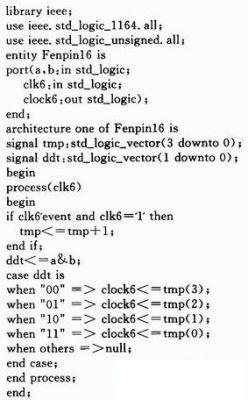 出租車車速控制模塊用于控制出租車的車速。圖1中,當(dāng)起/停開關(guān)及清零信號RESET都為“1”時,汽車啟動就開始進(jìn)入里程計(jì)數(shù)和計(jì)費(fèi)器工作狀態(tài)。通過改變“車速選擇”端的輸入值可以控制汽車行駛快慢。用CLK6作為車速控制模塊的時鐘輸入,CLOCK6作為輸出,用A、B作為車速選擇變量,分別取值從“00”→“01”→“10”→“11”時,車速越來越塊。其VHDL程序代碼如下: