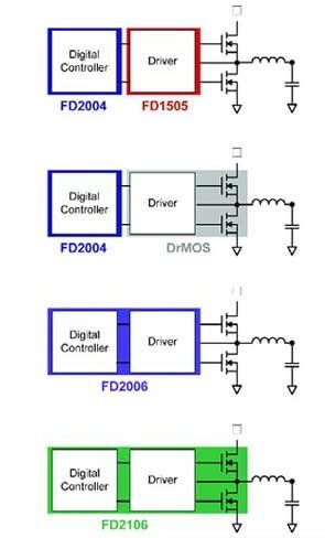 FD2004可以與外部柵極驅(qū)動器 (如FD1505) 和分立式MOSFET ,或是集成了驅(qū)動器與MOSFET的單封裝DrMOS產(chǎn)品協(xié)同工作。它還可以在獨(dú)立式應(yīng)用中通過電阻 來編程—特別地,輸出電壓的最大值由電阻設(shè)定,且利用軟件命令設(shè)定的電壓最大值不得超過10%以上,以保護(hù)負(fù)載。在需要較大電流的應(yīng)用中,如多相轉(zhuǎn)換器,所選的架構(gòu)可實(shí)現(xiàn)多達(dá)8個相位的電流共享,而且可在輸出功率較低時實(shí)現(xiàn)切相 (phase shedding) 來保持高效率。該款控制器基于帶自適應(yīng)性能算法和環(huán)路補(bǔ)償?shù)臄?shù)字控制環(huán)路,支持高達(dá)1.4MHz的開關(guān)頻率。時鐘同步可協(xié)助提升EMI性能。對于同時需要集成式驅(qū)動器和分立式外部MOSFET的應(yīng)用,FD2006也是個不錯的選擇。