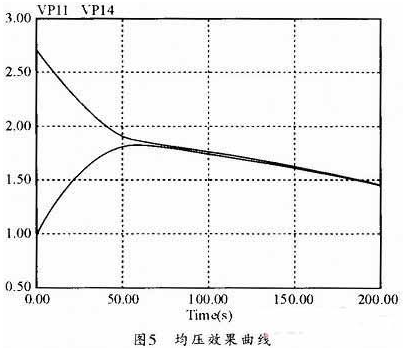 C1、C2初始電壓為2.7V,C3、C4為1V,仿真70s的時候基本均壓結(jié)束,電壓均衡到1.81V,由于電容并聯(lián)二極管的影響,電壓均衡點(diǎn)并沒有在算數(shù)平均值1.85V,并且升壓斬波器也消耗一部分能量。70s之后兩電容電壓基本保持同步變化。