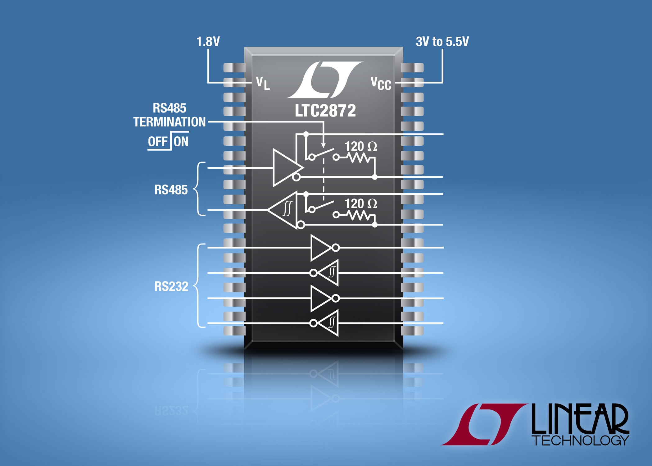 凌力爾特公司 (Linear Technology Corporation) 推出適用于 3.3V 和 5V 系統(tǒng)并具可通斷集成型終端的多協(xié)議收發(fā)器 LTC2872。RS485 系統(tǒng)需要在通信總線的末端上布設(shè)一個(gè)終端電阻器,以最大限度地減少信號(hào)反射。LTC2872 集成了引腳控制型終端電阻器以簡(jiǎn)化接口重新配置,從而免除了外部電阻器和控制繼電器。終端電阻器在啟用時(shí)可自動(dòng)接通或斷開,以與收發(fā)器所選擇的協(xié)議 (RS232 或 RS485) 相匹配。該器件還擁有高 ESD 防護(hù)能力:在收發(fā)器總線引腳上可達(dá) ±16kV HBM (在斷電或運(yùn)作時(shí))。LTC2872 可配置為采用共用 I/O 線路的 4 個(gè) RS232 單端收發(fā)器或 2 個(gè) RS485 差分收發(fā)器,或者此二者的組合,從而減少了多協(xié)議網(wǎng)絡(luò)的組件數(shù)目,并提供運(yùn)行中的可配置性。