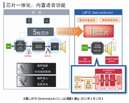 羅姆集團(tuán)旗下的LAPIS Semiconductor Co., Ltd.開(kāi)發(fā)出一款單芯片的低功耗微控制器“ML610Q380系列”產(chǎn)品,此產(chǎn)品將以往用于家電的控制IGBT的PWM電路和LCD驅(qū)動(dòng)器等微控制器功能、以及高音質(zhì)、低功耗的語(yǔ)音播放功能集于一枚芯片,這在業(yè)內(nèi)尚屬首家。由于以往用于家電的微控制器沒(méi)有語(yǔ)音播放功能,因此想追加語(yǔ)音功能時(shí),語(yǔ)音合成功能和功放需要由不同的芯片組成。而使用本LSI產(chǎn)品,不僅可以芯片一體化,而且可以替換掉以往用于家電的微控制器,輕松實(shí)現(xiàn)語(yǔ)音功能,是需要語(yǔ)音輸出的家用電器和遙控器的最佳選擇。