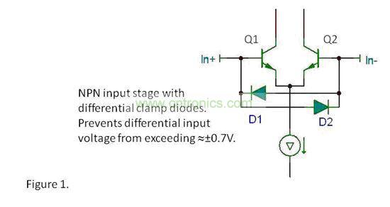 許多運算放大器都在輸入端之間有電壓鉗位,其大多數(shù)一般都使用背靠背二極管(有時使用兩個或者更多的串聯(lián)二極管)來實施。這些二極管保護輸入晶體管免受其基極結(jié)點反向擊穿的損害。差動輸入為約6V 時便會出現(xiàn)許多IC 工藝擊穿,這會極大地改變或者損壞晶體管。下圖顯示了NPN 輸入級,D1 和D2 提供了這種保護功能。