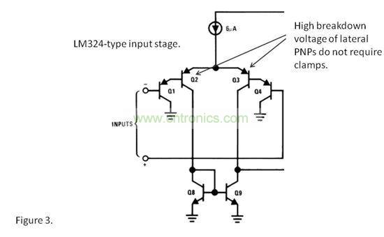 使用橫向PNP 輸入晶體管的通用運算放大器一般沒有輸入鉗位,例如:LM324" target="_blank" title="Link to Product Folder">LM324、LM358" target="_blank" title="Link to Product Folder">LM358、OPA234" target="_blank" title="Link to Product Folder">OPA234、OPA2251" target="_blank" title="Link to Product Folder">OPA2251 和OPA244" target="_blank" title="Link to Product Folder">OPA244。這些運算放大器一般為“單電源”類型,其意味著它們擁有一個擴展至負電源端(或者稍低)的共模范圍。輸入偏置電流為一個負數(shù)時,表示輸入偏置電流自輸入引腳流出。這時,我們通常可以認定它們?yōu)檫@類運算放大器。但是,需要注意的是,使用PNP 輸入的高速運算放大器一般有輸入鉗位,而這些PNP 是一些具有更低擊穿電壓的垂直PNP。