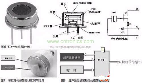 被動(dòng)式紅外傳感器有三個(gè)關(guān)鍵性的元件:菲涅爾濾光透鏡,熱釋電紅外傳感器和匹配低噪放大器。菲涅爾透鏡有兩個(gè)作用:一是聚焦作用,即將熱釋紅外信號(hào)折射在PIR上:二是將探測(cè)區(qū)內(nèi)分為若干個(gè)明區(qū)和暗區(qū),使進(jìn)入探測(cè)區(qū)的移動(dòng)物體/人能以溫度變化的形式在PIR上產(chǎn)生變化的熱釋紅外信號(hào)。一般還會(huì)匹配低噪放大器,當(dāng)探測(cè)器上的環(huán)境溫度上升,尤其是接近人體正常體溫(37℃)時(shí),傳感器的靈敏度下降,經(jīng)由它對(duì)增益進(jìn)行補(bǔ)償,增加其靈敏度。輸出信號(hào)可用來(lái)驅(qū)動(dòng)電子開(kāi)關(guān),實(shí)現(xiàn)LED照明電路的開(kāi)關(guān)控制。圖5是紅外傳感器外貌,圖6是紅外傳感器內(nèi)部結(jié)構(gòu)與內(nèi)部電路圖。圖7是帶紅外傳感器的LED照明燈具,這是一款E27標(biāo)準(zhǔn)螺口燈頭的燈具,其電源適用范圍是AC180V-250V(50/60Hz),紅外傳感器檢測(cè)范圍大約在3m~15m,其標(biāo)準(zhǔn)產(chǎn)品IFS-Bulb3W燈具達(dá)80lm,5W燈具達(dá)140lm.在LED光源模塊的中央部分嵌入紅外線傳感器。一旦紅外傳感器檢測(cè)到人的體溫,LED電燈泡將會(huì)在50s內(nèi)自動(dòng)開(kāi)啟與關(guān)閉。適用于任何一種室內(nèi)應(yīng)用,如走廊、儲(chǔ)藏室、樓梯和大廳入口處。