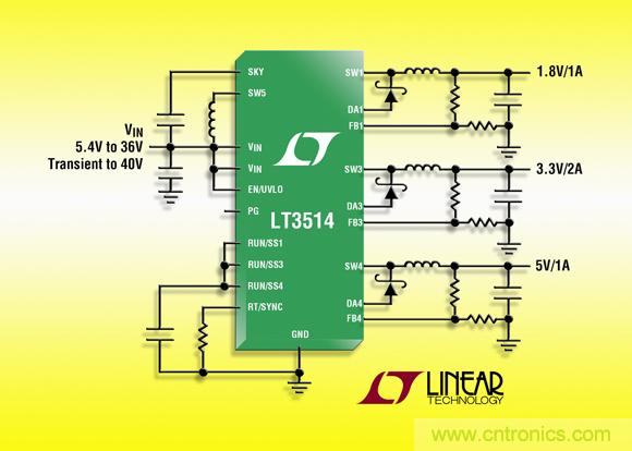 LT3514的開關(guān)頻率可由用戶編程在 250kHz 至 2.2MHz,且在整個(gè)頻率范圍內(nèi)是可同步的,從而使設(shè)計(jì)師能優(yōu)化效率,同時(shí)避開了關(guān)鍵的噪聲敏感頻段。其 28 引線 4mm x 5mm QFN 封裝和高開關(guān)頻率允許使用小型的外部電感器和電容器,可為多輸出應(yīng)用提供占板面積緊湊和熱效率很高的解決方案。