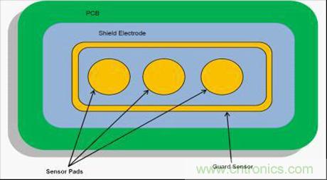 因電容式感應鈕令家電外觀時尚,避免磨損問題,因此,相對機械按鈕成為了首選技術(shù)。許多家電要在液體附近使用,需要有防水功能,以免有水情況下造成假觸發(fā)。圖1顯示了電容式傳感器印刷電路板(PCB)的典型布局。將圍繞傳感器(藍色)的交叉網(wǎng)格(hatched pattern)連接至保護電極(而不是接地)就可實現(xiàn)防水功能。