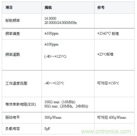 車載HCR®「XRCHA-F-A」系列的產品外觀如圖1所示,產品規(guī)格如圖2所示。車載用晶體時鐘的需求很多,從16MHz到24MHz都有相應產品。采用的尺寸是2.5×2.0mm,和同一頻帶的傳統(tǒng)晶體相比體積減少了37%。此外,原來的晶振使用的是玻璃密封和熔接的是密封性的封裝,HCR®如上所述,是在平板上用金屬帽這種簡單的構造,既經濟又同時實現(xiàn)了高品質的晶振。主要面向ECU、ABS、EPS、車身ECU等,標準的高精度化車載ECU的應用。工作溫度范圍是-40~+125℃,但是也可以被應用在+150℃的環(huán)境。