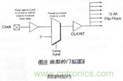 這 是最廣泛使用的方法,即在器件末使用時截斷時鐘來降低功耗。然而正確地截斷時鐘十分重要。門控信號與門控邏輯應(yīng)正確地設(shè)計,以消除時鐘線上的任何毛刺。再 者,門控邏輯會增加時鐘的延時,影響建立時間與保持時間。由于抗熔斷是一種極快速的技術(shù),引入的延時很小且容易控制。在使用時鐘門控時,用戶應(yīng)仔細(xì)地安置 門控邏輯,將時鐘網(wǎng)絡(luò)的延時降低到最小限度。典型的門控邏輯如圖3所示。