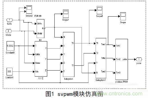 PlD控制有很強(qiáng)的生命力,它對(duì)于大多數(shù)過(guò)程都具有良好的控制效果和魯棒性,而且算法原理簡(jiǎn)明,參數(shù)物理意義明確,理論分析體系完整且應(yīng)用經(jīng)驗(yàn)豐富。因此針對(duì)系統(tǒng)中的抑制干擾特性這一方面的要求可以采用PID控制器。對(duì)單電機(jī)的控制采用雙閉環(huán)設(shè)計(jì),通過(guò)svpwm進(jìn)行調(diào)速,使系統(tǒng)具有良好的穩(wěn)定性,svpwm調(diào)速模塊仿真圖如圖1所示。然后將兩臺(tái)電機(jī)反饋回來(lái)的轉(zhuǎn)速差作差,再通過(guò)PID調(diào)節(jié)作為當(dāng)負(fù)載有變化時(shí)的轉(zhuǎn)速反饋額外補(bǔ)償。系統(tǒng)仿真模型如圖2所示。