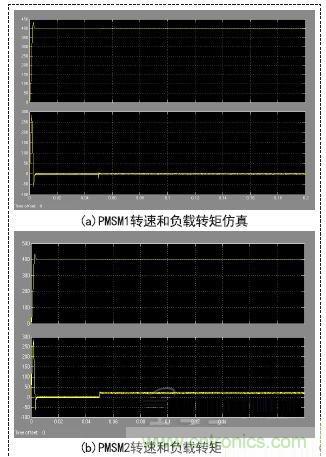 將電機(jī)轉(zhuǎn)速設(shè)定為400r/min,讓電機(jī)進(jìn)行零負(fù)載啟動(dòng)。設(shè)定仿真時(shí)間為0.2s,為了驗(yàn)證負(fù)載改變對(duì)系統(tǒng)產(chǎn)生的影響和雙電機(jī)的跟隨性能,在t=0.05s時(shí),給PMSM2突加一個(gè)TM=20N·m的負(fù)載轉(zhuǎn)矩。仿真圖形如圖3所示。