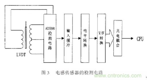 如圖3所示,由于采用了最新的大規(guī)模集成電路,電感傳感器的檢測電路比較簡單,且集成電路采用了新的調制解調方法和算法,減少了以前的檢測外差式調頻檢測電路方法由于傳感器的激勵信號的相角、頻率以及幅值漂移對檢測結果的影響,大大進步了檢測精度和穩(wěn)定性。