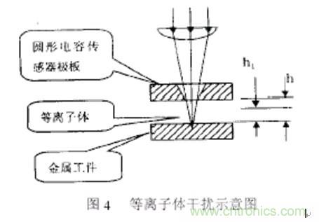 在工件尚未被切穿的瞬間,激光和金屬相互作用,在噴嘴和加工對象之間產生云霧狀等離子體,改變電容極板之間的介質,從而對電容傳感器產生干擾。在正常切割過 程中,輔助氣體將等離子體從切縫中吹散,對電容傳感器產生影響較小。但假如加工速度太快和剛開始切割時,由于工件未被完全切穿,激光照射點四周會產生等離 子體云,對電容傳感器產生干擾,嚴重時甚至使傳感器無法正常工作,嚴重影響加工質量。圖4為等離子體干擾示意圖。