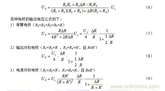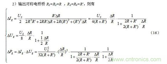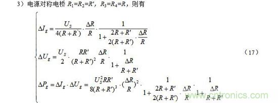 注意:上面(7)~(9)式中的R和其R′ 均為預(yù)調(diào)平衡后的電阻。此外,當(dāng)電阻增量△R較小時,即滿足△R《《R時,上面(7)~(9)三式的分母中含△R項可略去,公式可得以簡化,這里從略。