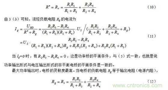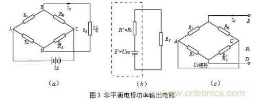 (3)Rg相對橋臂電阻可比擬時的非平衡電橋(功率輸出形式)當(dāng)負(fù)載電阻Rg與橋臂電阻可比擬時,則電橋不僅有輸出電壓Ug,也有輸出電流Ig,也就是說有輸出功率,此種電橋也稱為功率橋。功率橋可以表示為圖3(a)。