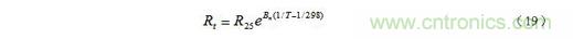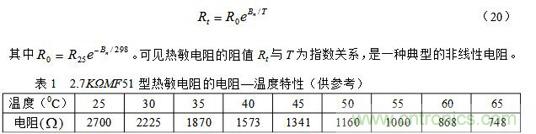 其中R25和Rt分別為25℃和t℃時熱敏電阻的阻值,T = 273 + t;Bn為材料常數(shù),其值因制作時不同的處理方法而異,對確定的熱敏電阻,可以由實驗測得的電阻—溫度曲線求得。我們也可以把(19)式寫成比較簡單的表達(dá)式