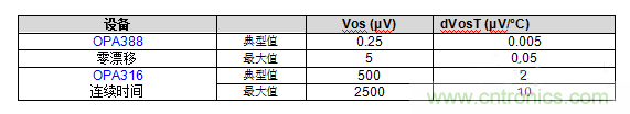 表1顯示了連續(xù)時(shí)間和零漂移放大器的Vos和dVos/dT的比較。請注意,零漂移放大器的Vos和dVos/dT要小三個(gè)數(shù)量級。