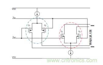 傳統(tǒng)的軌到軌輸入CMOS架構(gòu)具有兩個(gè)差分對;一個(gè)PMOS晶體管對(藍(lán)色)和一個(gè)NMOS晶體管對(紅色)。具有軌到軌輸入操作的零漂移放大器使用圖1所示的相同互補(bǔ)p溝道(藍(lán)色)和n溝道(紅色)輸入配置。