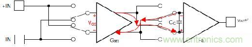 圖4顯示了后半個(gè)周期。在這里,兩組開關(guān)都配置為通過未改變的方式傳遞信號和失調(diào)誤差。實(shí)際上,輸入信號永遠(yuǎn)不會發(fā)生相位變化,始終保持不變。由于來自第一時(shí)鐘相位和第二時(shí)鐘相位的失調(diào)誤差極性相反,因此誤差被平均為零。