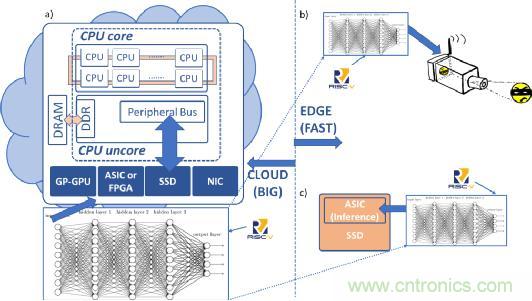 在圖1a中,云數(shù)據(jù)中心服務(wù)器利用在大型大數(shù)據(jù)集上訓(xùn)練的深度學(xué)習(xí)神經(jīng)網(wǎng)絡(luò)來執(zhí)行機器學(xué)習(xí)的功能。在圖1b中,邊緣設(shè)備中的安全攝像機采用經(jīng)過大數(shù)據(jù)訓(xùn)練的推理引擎來實時識別圖像(快速數(shù)據(jù))。在圖1c中,智能固態(tài)硬盤設(shè)備采用推理引擎進(jìn)行數(shù)據(jù)識別和分類,從而有效地利用了此設(shè)備的帶寬。圖1展示了RISC-V內(nèi)核的潛在機會,它可以自由地添加專有的及未來標(biāo)準(zhǔn)化的矢量指令,這些指令對于處理深度學(xué)習(xí)和推理技術(shù)相當(dāng)有效。
