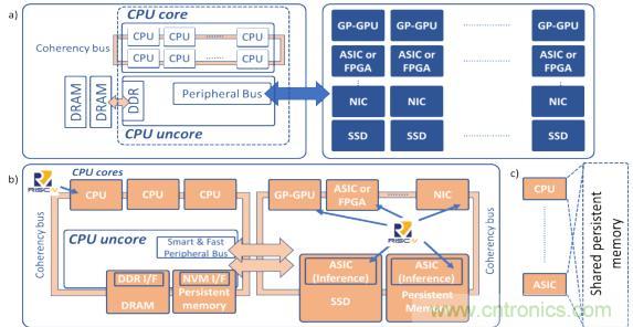在圖2a中,傳統(tǒng)的計算體系結(jié)構(gòu)由于把一條慢速外設(shè)總線用于快速存儲器及計算加速設(shè)備,其能力已達(dá)到其極限。在圖2b中,未來的計算體系結(jié)構(gòu)采用了開放接口,能夠為平臺上所有的計算資源提供統(tǒng)一并支持高速緩存一致性的訪問方式來訪問共享持久內(nèi)存,(這稱為以數(shù)據(jù)為中心的體系結(jié)構(gòu))。在圖2c中,所部署的設(shè)備能夠使用相同的共享內(nèi)存,從而減少了不必要的數(shù)據(jù)復(fù)制。