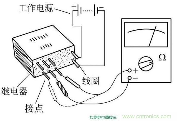 給繼電器線圈接上規(guī)定的工作電壓,用萬用表“Rx1K”檔,檢測節(jié)點(diǎn)的通斷情況。
