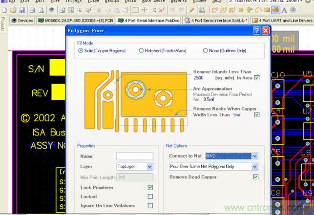 我們通過菜單上的快捷鍵來進(jìn)行鋪銅操作,可以選擇實(shí)心鋪銅或網(wǎng)格鋪銅的模式,然后在 Net options下的 Connect to Net 選擇連接到合適的網(wǎng)絡(luò),一般連接到 GND網(wǎng)絡(luò),同時(shí)一般可以選中下面的移除死銅菜單。然后在合適的區(qū)域內(nèi)進(jìn)行鋪銅的操作。