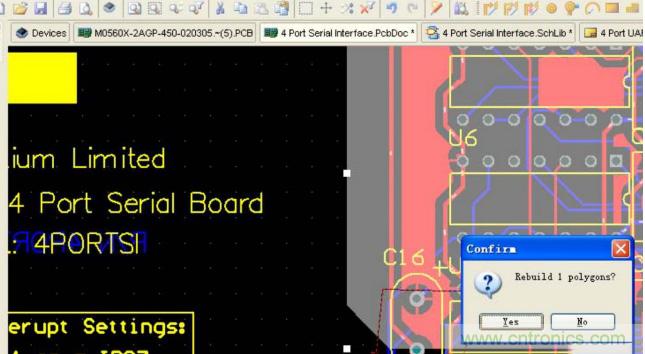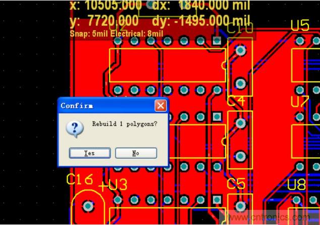 系統(tǒng)會提示你進(jìn)行重新鋪銅,點(diǎn)擊 YES 。